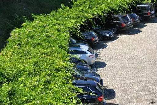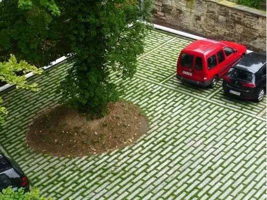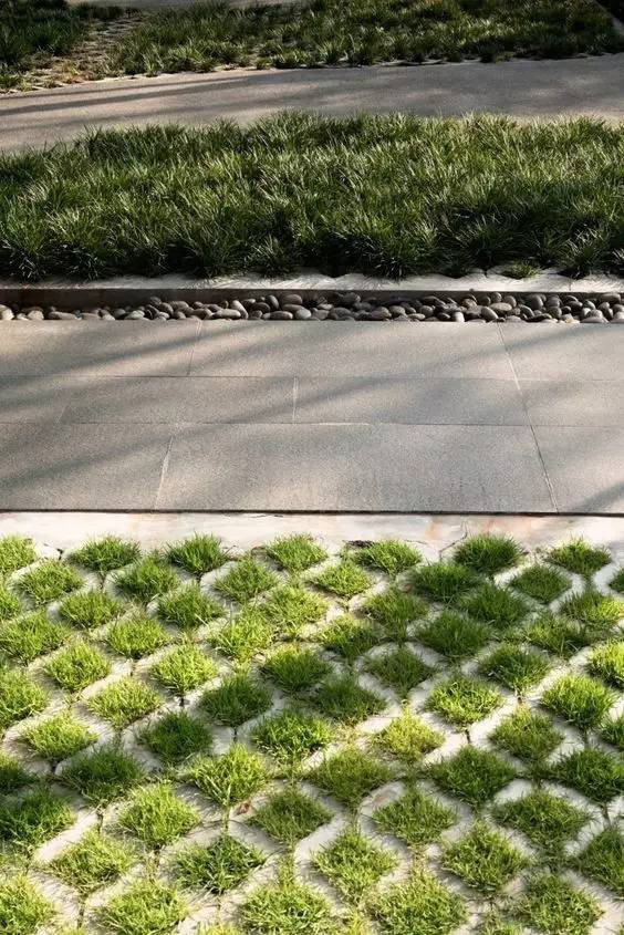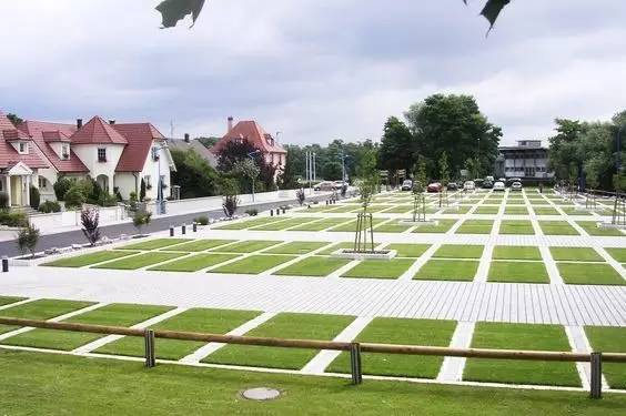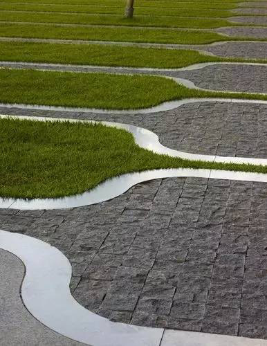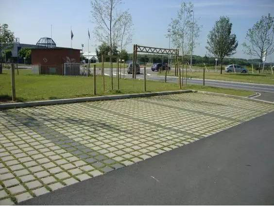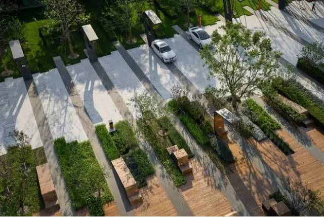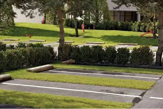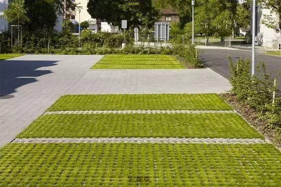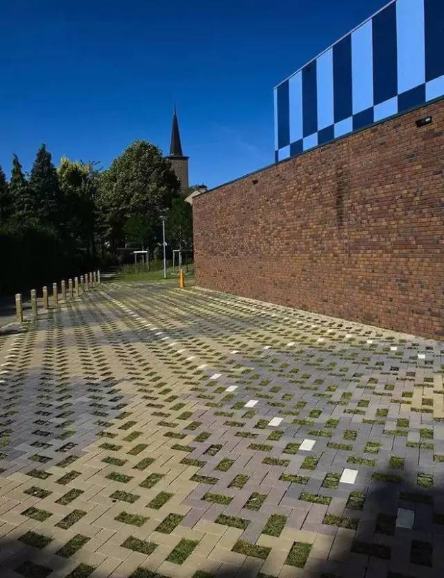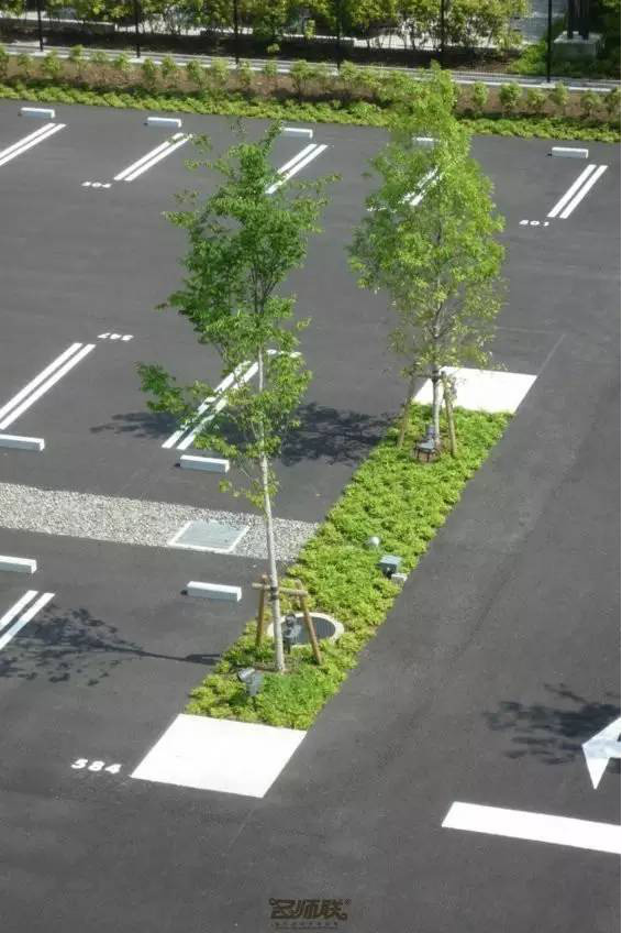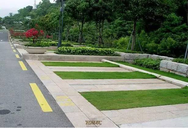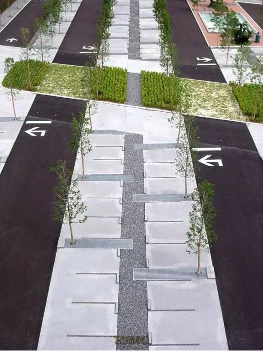 利于更換及修補的防滑鋪裝材料,以及它的透水性,加上鋪設尺寸符合人體工程學,真是人性、環(huán)保、安全而美觀。而停車場周圍的綠植,起到降溫作用,視覺上也美化了場景,愉悅內(nèi)心,安全出行,再好不過。