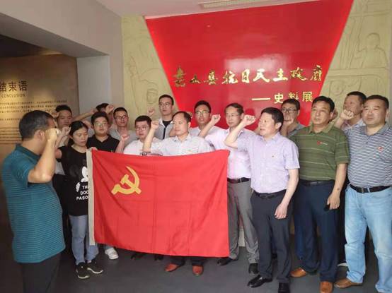 在紀念館史料展廳背景前,面對鮮紅的中國共產黨黨旗,全體黨員莊嚴地舉起右手,握緊拳頭,集體宣讀入黨誓詞,重溫入黨時的莊嚴承諾和堅定決心。